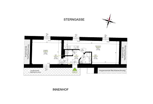 Auf einer Wohnfläche von ca. 58,2m² verteilen sich am Anfang der Friedrichgasse neben der ÖGK bzw. nähe Augarten und trotz der zentralen Lage ziemlich ruhig gelegen im 3. Obergeschoß (letzter Stock) ohne Lift perfekt wie folgt: 2 Zimmer, davon 1 größeres Wohn- Esszimmer ca. 25,9m² mit sonnigem West-Balkon ca. 4m² inkl. Markise und neuwertiger Einbauküche inkl. Geschirrspüler etc. (nicht getr. begehbar), 1 größeres Schlafzimmer ca. 17,7m² (getr. begehbar), Abstellraum, Vorraum, Bad ca. 4m² mit Dusche und WM-Anschluss, extra WC, Parkett- bzw. Fliesenböden, Fernwärme, UPC- bzw. Telekom-Anschluss. Fotos bzw. Grundriss unter: www.trendsetter-immobilien.at Die Wohnung ist optimal geeignet für ein Pärchen oder Singles (z.B. Studenten). Wohnbeihilfe möglich. Provisionsfrei. GVB-Verbindung mit dem Bus: 30er, 31er, 32er, 33er, 34er, 39er, 40er, 67er und wenige Schritte entfernt Straßenbahn: 1er, 3er, 4er, 5er, 6er, 7er, 16er, 17er. |