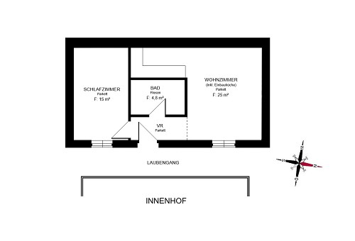 Auf ca. 48m² verteilen sich am Griesplatz nähe Augarten in den Innenhof ausgerichtet im 1. Obergeschoß ohne Lift perfekt wie folgt: 2 Zimmer, davon 1 größeres und ruhiges Wohn- Esszimmer ca. 25m² mit räumlich abgetrennter Küche möbliert – Einbauküche inkl. Geschirrspüler etc. – Innenhof (getr. begehbar), 1 ruhiges Schlafzimmer ca. 15m² - Innenhof (beide Zimmer getr. begehbar), Vorraum, neuwertiges Bad ca. 4,8m² mit Dusche / WC und Sprossenheizkörper, Parkettböden, Fernwärme, UPC- bzw. Telekom-Anschluss. Die Wohnung ist optimal geeignet für ein junges Pärchen oder Singles (z.B. Studenten). Wohnbeihilfe möglich. Provisionsfrei. GVB-Verbindung mit dem Bus: 31er, 32er, 33er, 39er, 40er, 67er. |