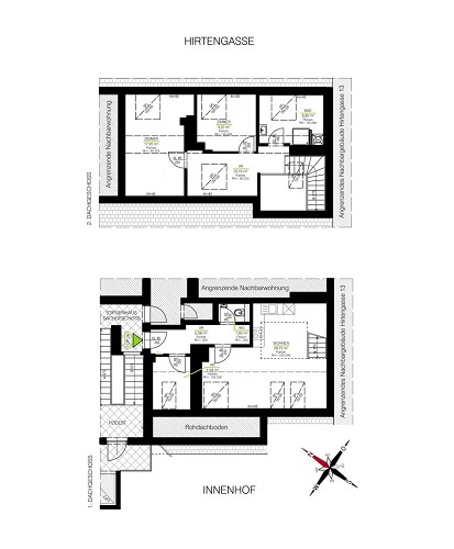 Auf ca. 89 m² verteilen sich in der Hirtengasse nähe Hauptbahnhof im Dachgeschoß (Maisonette über 2 Etagen)) mit Lift erreichbar perfekt wie folgt: 3 Zimmer, davon 1 größeres und helles Wohn- Esszimmer ca. 29,7m² mit neuer Einbauküche inkl. Geschirrspüler etc. und neuer Klimaanlage (nicht getr. begehbar), 1 helles Schlafzimmer ca. 17,2m² (getr. begehbar), 1 helles Arbeits- oder Schlafzimmer ca. 9,2m² (getr. begehbar), 1 größerer Abstellraum ca. 5,6m² mit Fenster, 2 Vorräume, neu saniertes bzw. großes Bad ca. 8,8m² mit Dusche / Fenster / WM-Anschluss und Sprossenheizkörper, neu saniertes WC mit Waschbecken, Parkettböden, UPC- bzw. Telekom-Anschluss, Fernwärme. Erstbezug nach Generalsanierung! Die Wohnung ist optimal geeignet für ein Pärchen. Wohnbeihilfe möglich. Provisionsfrei. GVB-Verbindung mit dem Bus: 40er, 53er, 62er, 67er. |