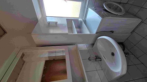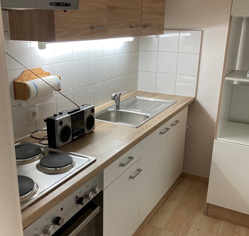 Die Wohnung verfügt über 1 kleinen Raum, 1 Zimmer, Bad mit Dusche und WC, 1 Raum mit Küchenblock.